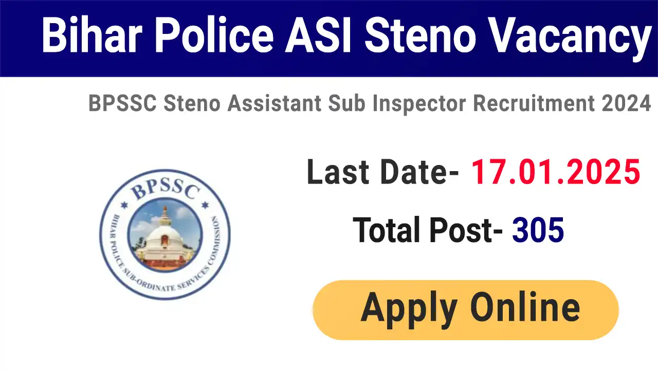 बिहार पुलिस अधीनस्थ सेवा आयोग BPSSC ने बिहार पुलिस सहायक उप निरीक्षक ASI Steno 2024 विज्ञापन जारी किया है। जो उम्मीदवार BPSSC ASISteno रिक्ति के लिए इच्छुक हैं वे 17/12/2024 से 17/01/2025 तक ऑनलाइन आवेदन कर सकते हैं। बिहार पुलिस Stenographerअसिस्टेंट सब इंस्पेक्टर परीक्षा 2024 रिक्ति 2025 भर्ती से संबंधित अन्य जानकारी जैसे आयु सीमा, योग्यता, वेतनमान और अन्य सभी जानकारी के लिए विज्ञापन पढ़ें और फिर